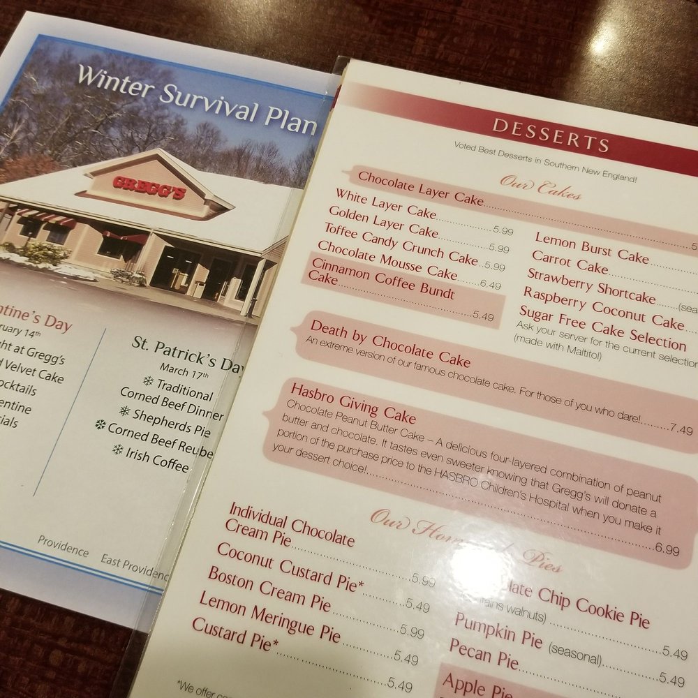 Gregg's Restaurants in Warwick, Rhode Island, offers a diverse menu with American cuisine focusing on desserts. The restaurant provides a range of appetizers like Calamari Alla Mama and Jordan's Cheese Fries, along with soups like Baked Onion Soup and Chili with Cheese & Onions. Their Sensational Salads feature options like Salmon Caesar Salad and Apple Walnut Salad. Customers praise Gregg’s for its consistency, cozy atmosphere, and delicious desserts, with reviews highlighting the excellent chocolate layer cake. With a vast menu, friendly service, and affordable prices, Gregg's Restaurants is a Rhode Island tradition worth trying.
